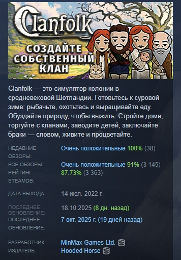 Clanfolk — это симулятор колонии в средневековой Шотландии. Готовьтесь к суровой зиме: рыбачьте, охотьтесь и выращивайте еду. Обуздайте природу, чтобы выжить. Стройте дома, торгуйте с кланами, заводите детей, заключайте браки — словом, живите и процветайте.