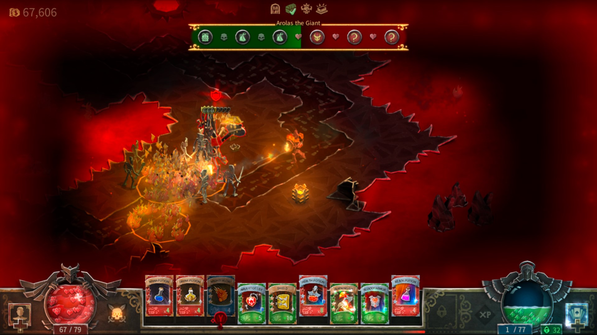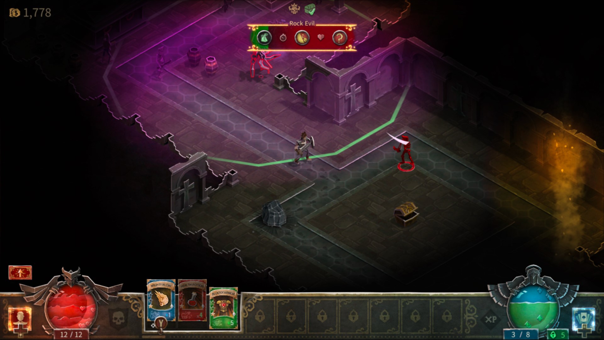 Карты и построение колоды. Это не карточная игра, но предметы, заклинания и навыки представлены в виде карт. Стратегия заключается в адаптации вашей руки к каждой ситуации. Карты можно улучшать с помощью рун, и вы можете найти множество вариантов с разнообразными бонусами. Легендарные предметы — самые эпические, но их трудно приобрести.