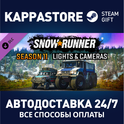 Дополнение *Сезон 11* входит в сезонный пропуск третьего года для SnowRunner. Мотор! Доставьте снаряжение для киносъемок и помогите курорту привести в порядок инфраструктуру перед сезоном. Вас ждут два грузовика и две новых зимних карты.