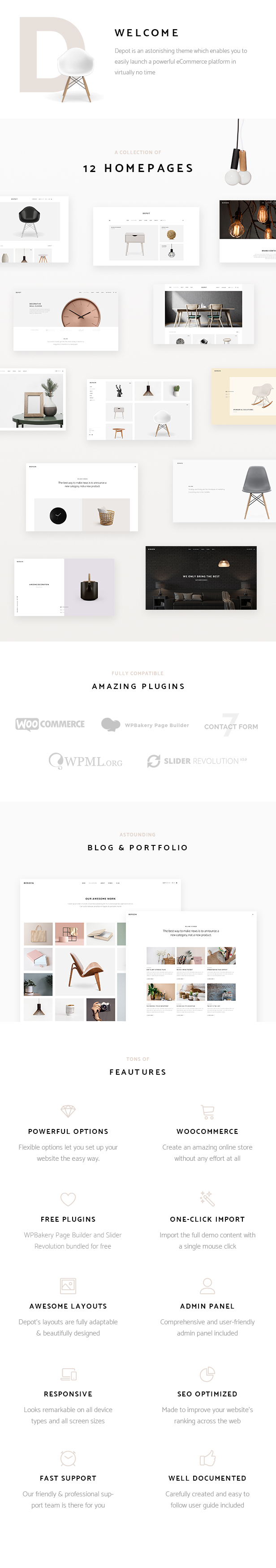 Добро пожаловать в Depot, современную тему WordPress , которая поможет вам в мгновение ока запустить мощную платформу электронной коммерции. Depot включает 12 современных домашних страниц и большую коллекцию внутренних страниц. Тема специально создана для любого типа мебельного магазина и идеально подходит для представления мебельных брендов и предметов. Кроме того, он поставляется с потрясающим набором макетов блогов и портфолио, двумя бесплатными плагинами премиум-класса и бесконечными возможностями магазина. Продавайте как профессионалы и будьте заметны вместе с Depot.