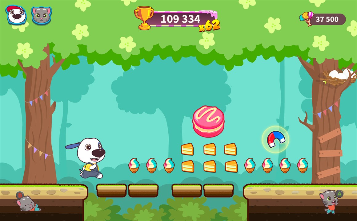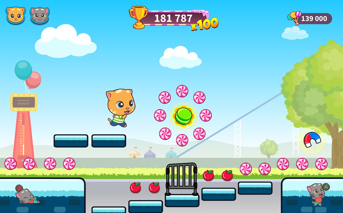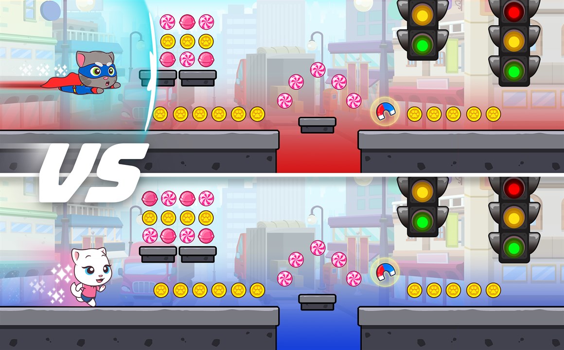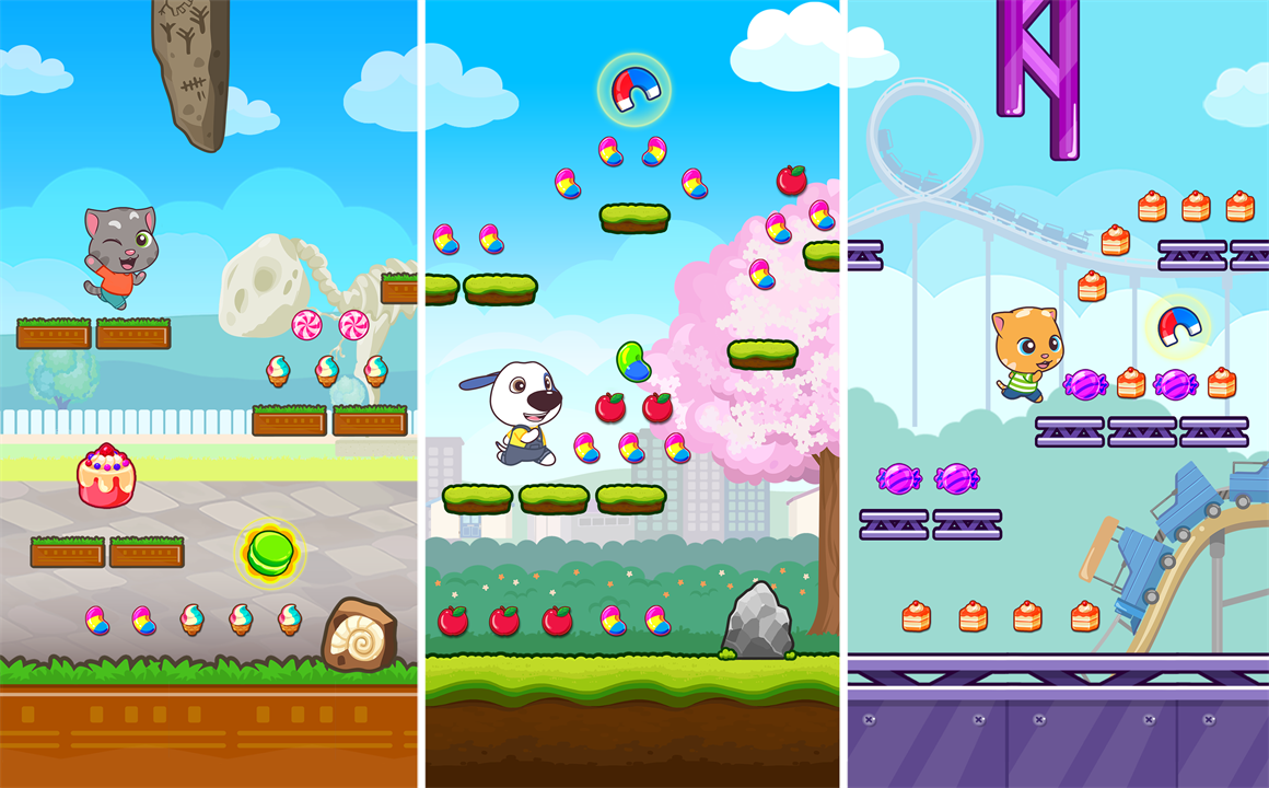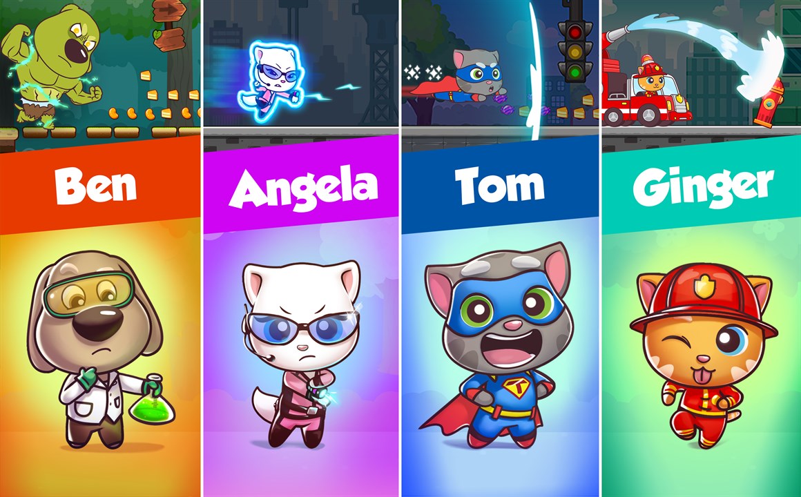 Your amazing new endless runner adventure starts now. The robber has stolen your candy, but he is dropping it everywhere – along the street, at the beach, even at the amusement park! Choose your favorite Talking Tom and Friends character and get ready to run, jump, and slide your way through an epic, candy-filled adventure. Pick up chests to get free coins, diamonds, new characters, and character upgrades. Chase after the robber with fun buddies who will help you with their awesome special abilities.