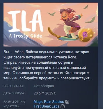 Вы — Айла, бойкая ведьмочка-ученица, которая ищет своего потерявшегося котенка Коко. Отправляйтесь на волшебный остров и исследуйте причудливый открытый маленький мир. С помощью верной метлы-скейта находите тайники, собирайте предметы и совершенствуйте навыки магии и полета на пути к идеалу.