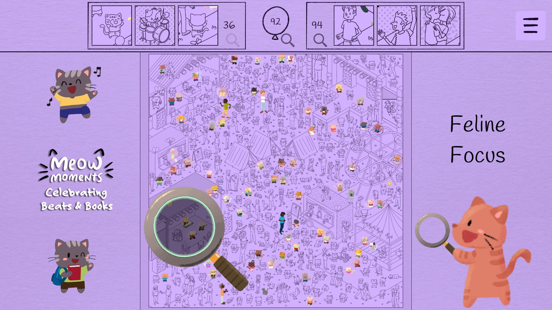 Примите участие в празднике! В этом уютном приключении жанра "поиск предметов" коты и их друзья собираются вместе, чтобы раскрывать творчество, связи и самовыражение в двух ярких сценах. Каждая деталь наполнена историями, которые оживают там, где музыка и учёба объединяют всех.