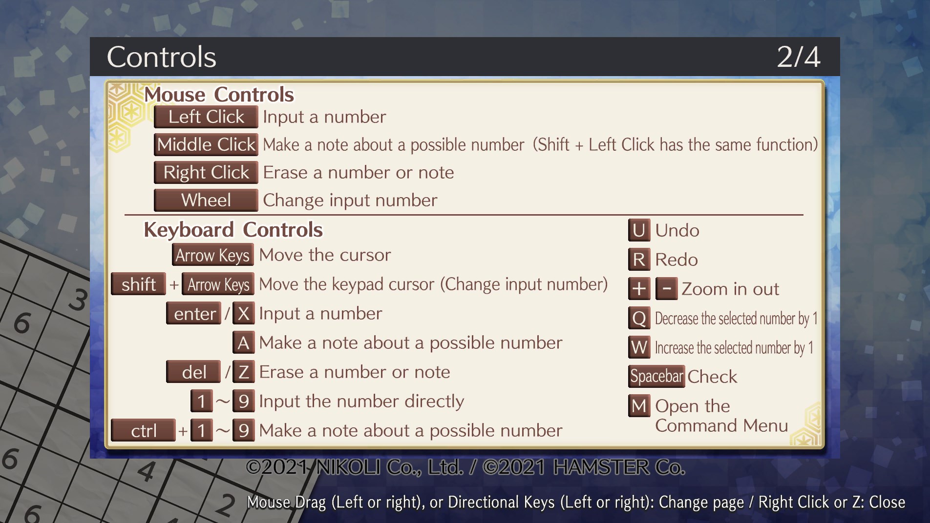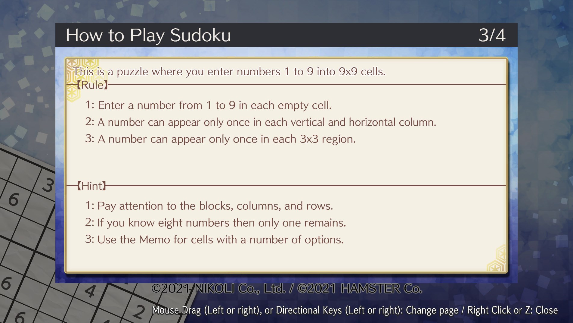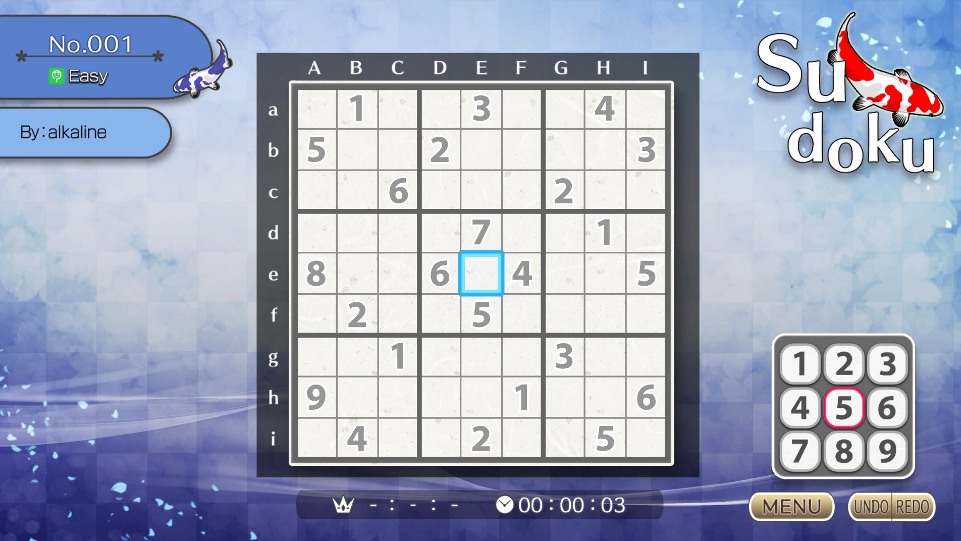 Sudoku is a puzzle in which you place numbers from 1 to 9 into a 9x9 grid, divided into horizontal and vertical lines and 3x3 blocks, filling up all of the spaces with the numbers. With everything from simple puzzles to super-difficult ones, this game is popular with a wide range of players, from beginners to veterans. Please enjoy this high-quality sudoku game.