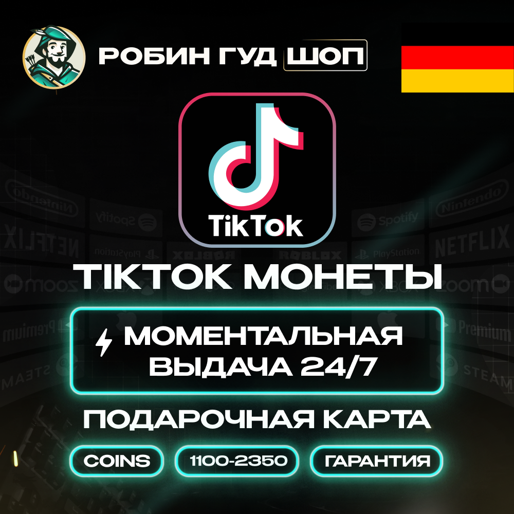 <delivery>* После оплаты вы получаете уникальный код подарочной карты TikTok номиналом от 1100 до 2350 монет. Только для аккаунтов с регионом ГЕРМАНИЯ.** Моментальная автоматическая доставка кода</delivery>