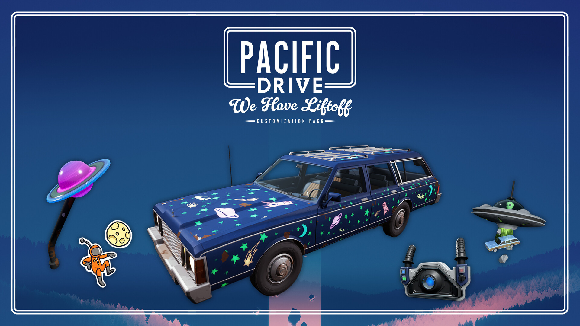 Отправляйтесь в удивительное приключение с набором предметов персонализации для Pacific Drive. Сюда вошли дополнительные предметы в тематике исследования космоса — добавьте стиля своему транспорту!