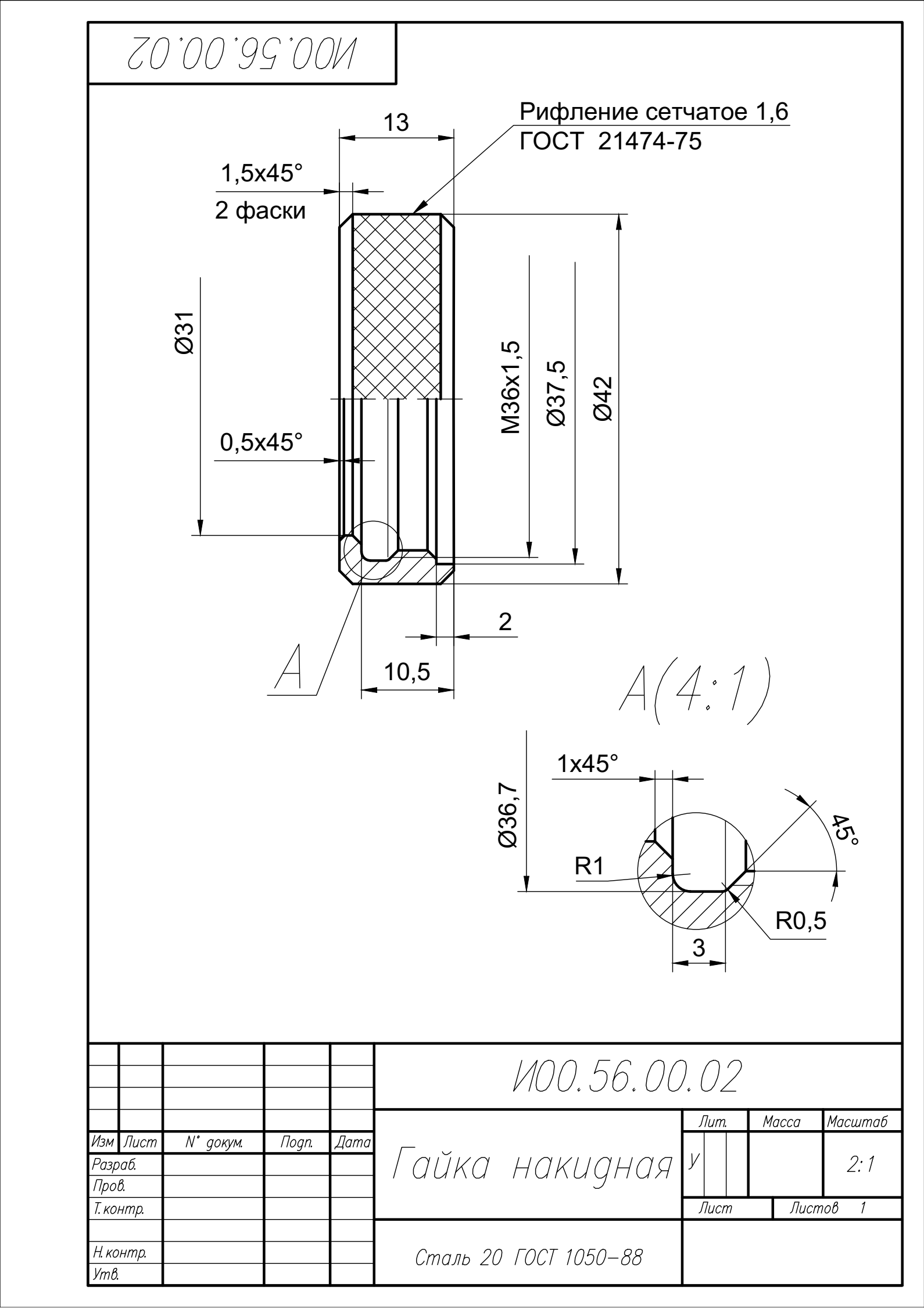 Рабочий чертеж детали гайка накидная И00.56.00.02 из сборки И00.56.00.00 маслораспылитель двойного распыления. Чертеж выполнен в программе AutoCAD