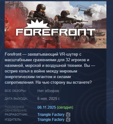 Новая игра от создателей Breachers и Hyper Dash. Forefront — совершенно новый вариант военных игр в виртуальной реальности. Участвуйте в массовых боях на 32 игрока на разнообразных масштабных частично разрушаемых картах. Ключ к победе — стратегия, навыки и командная работа.