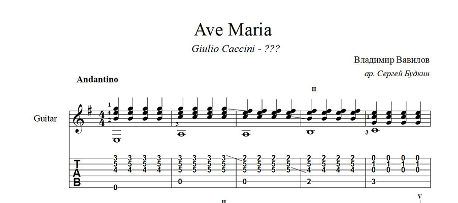 Аранжировка для гитары композиции Владимира Вавилова Ave Maria, которую он выдал за произведение итальянского композитора Джулио Каччини.