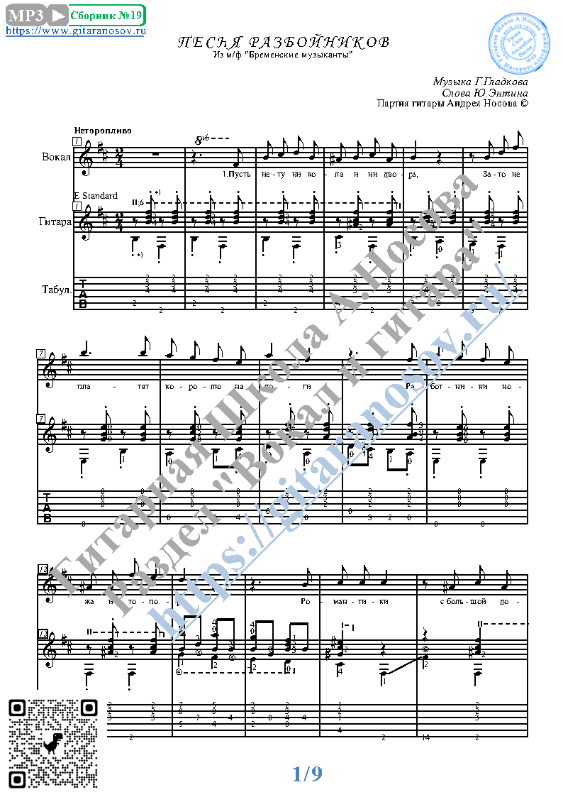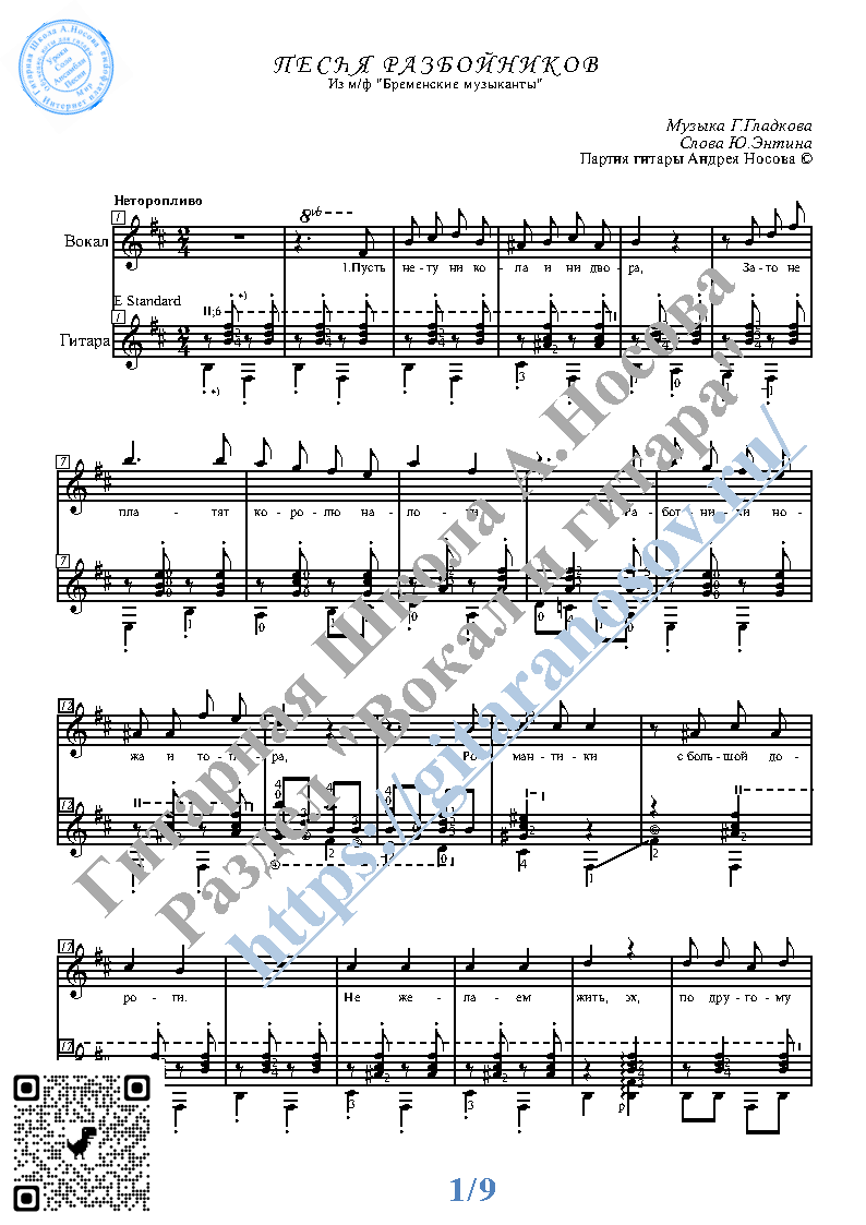 <attention>Кликните "Подробнее" для получения дополнительной информации</attention>Вашему вниманию предлагается композиция "Песня разбойников (муз.Г.Гладкова, сл.Ю.Энтина)", предназначенная для вокала в сопровождении 6-ти струнной гитары. Запись выполнена нотами и включает в себя партию вокала с подтекстовкой, партию гитары с подробнейшей аппликатурой и текст песни (НА РУССКОМ).