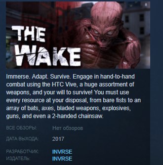 The Wake is a groundbreaking Virtual Reality game coming soon to the HTC Vive. Engage in hand-to-hand melee combat in a room-scale survival game unlike anything you have seen or felt. Follow characters through a narrative that will play out in real-time, with professionally motion captured actors and actresses interacting with the player between escalating waves of mutating zombies. To survive, you must use every resource at your disposal, from bare fists to an array of bats, axes, bladed weapons, explosives, guns, and even a 2-handed chainsaw.