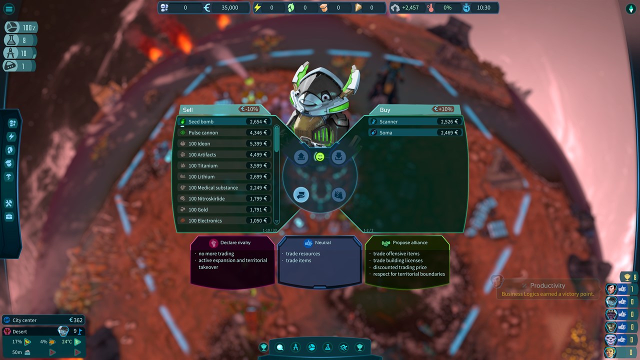 Каждая разведанная планета - гонка за экономическое господство. Доступные ископаемые ресурсы способствуют быстрому развитию, а торговля акциями колонии покрывает дефицит финансов. Выкуп оппонентов тоже возможен.