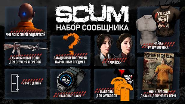 Все предметы, которые вы получите, предназначены исключительно для визуального оформления и никак не влияют на игру. Другие предметы будут добавляться в пакет сторонника по мере того, как мы будем продвигаться в период раннего доступа SCUM. Пакет поддержки SCUM включает в себя следующие цифровые предметы: