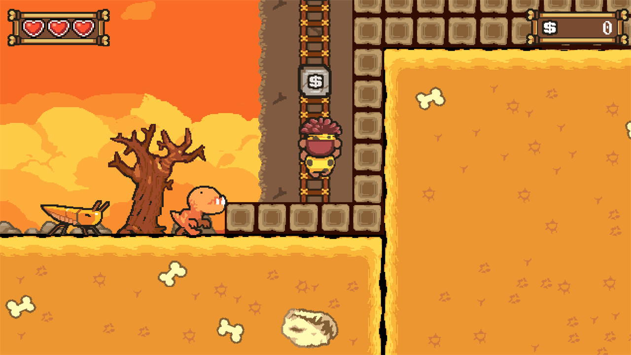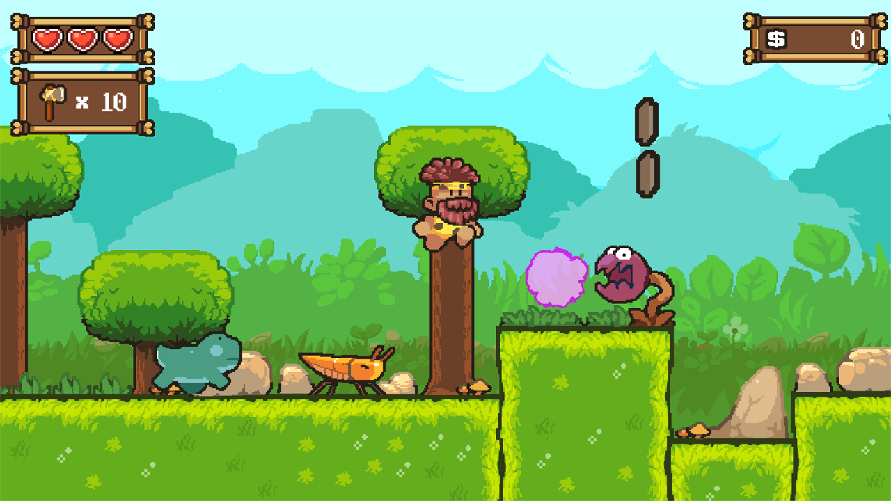 Наш герой должен победить пещерных бандитов и освободить деда. Прыгай, обходи ловушки и карабкайся по лестницам. Дави динозавров прыжками и получай дальнобойное оружие каменного века. Сражайся с боссами бандитов. Собирай монеты и трать их в магазине на повышение уровней.