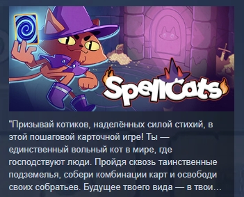 "Призывай котиков, наделённых силой стихий, в этой пошаговой карточной игре! Ты — единственный вольный кот в мире, где господствуют люди. Пройдя сквозь таинственные подземелья, собери комбинации карт и освободи своих собратьев. Будущее твоего вида — в твоих лапах!"
