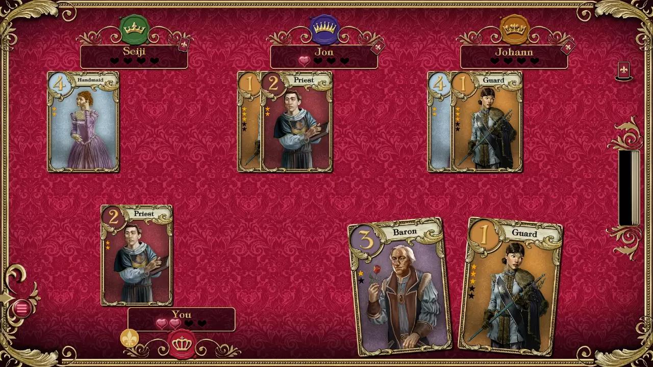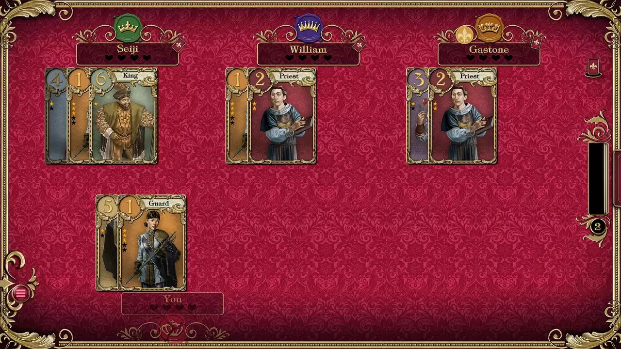 DRAW, PLAY AND BLUFF, FOR ONLY ONE SUITOR WILL BE ABLE TO WIN THE HEART OF THE PRINCESS You and other suitors are prepared to do anything to get your love letter to the princess. She´s shut herself inside her palace, so you´re forced to use go-betweens to deliver the message. Guards, princes, the king, the countess... Who will turn out to be the best ally to help win your beloved´s heart? You only ever have two cards in your hand. Draw and play your cards to get closer to the princess. Everyone staying in the castle could aid you in their own way: guards and princes can help discredit letters from other suitors, priests will give you precious information about your rivals while the handmaiden will protect your letter at any cost! As the game progresses, you´ll have to think strategically, bluff and try to read your opponents´ game. When the deck is used up, the card in your hand will be the character holding your letter for the princess. The strongest card, i.e. the character who´s closest to the princess, wins! Send the other suitors packing, gain the advantage and win the game. Let´s get started! Features: Simple rules and quick turns in this game adapted from the multi-award winning card game Love Letter 1 to 4 players Play in single-player mode against the computer, against your friends in private multiplayer or face suitors from all over the world in online mode 16 cards representing 8 types of characters found at the Court: Guards, Priests, Barons, Handmaidens, Princes, King, Countess and of course the Princess