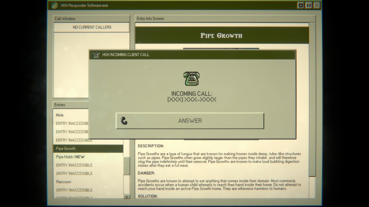 Горячая Линия Домашней Безопасности - это аналоговый хоррор про телефонного оператора, где вы отвечаете на вопросы звонящих о том, что находится в их доме. Ознакомьтесь с обширным каталогом распространенных вредителей и бытовых опасностей и сделайте все возможное, чтобы стать экспертом в области домашней безопасности. Вы будете нести ответственность за то, что произойдет.