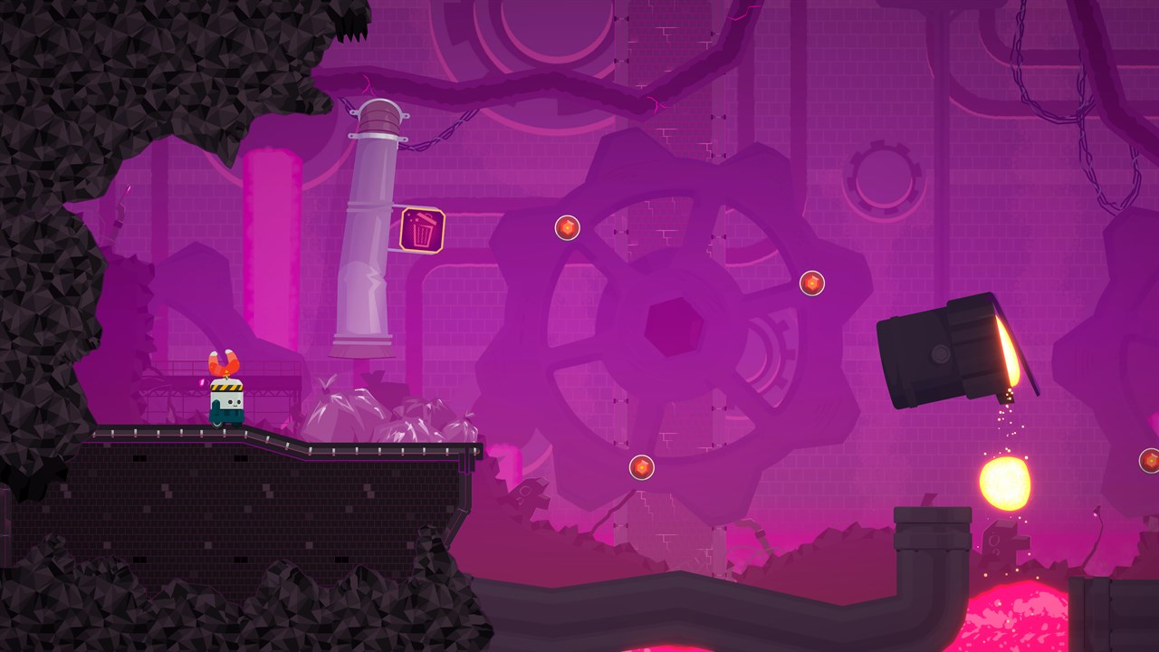 Help Chip save the lost Battery Bots on a perilous journey through the treacherous depths of a robot assembly factory. The catch? The Hooks! When piloting Chip, you can´t jump, but you can soar over pits of molten metal, giant crushers, pools of toxic waste, shifting saws and high-powered lasers using your trusty head-mounted grapple!