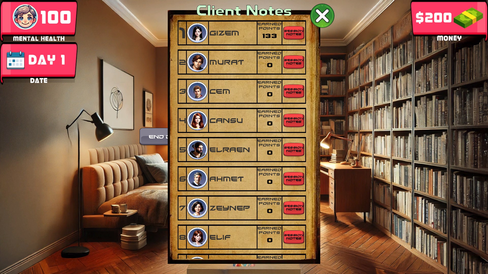 Клиентские сеансы: Вы можете провести максимум 5 сеансов с каждым клиентом. Если в конце сеанса вы набираете достаточно очков, клиент соглашается прийти на следующий сеанс. В про
