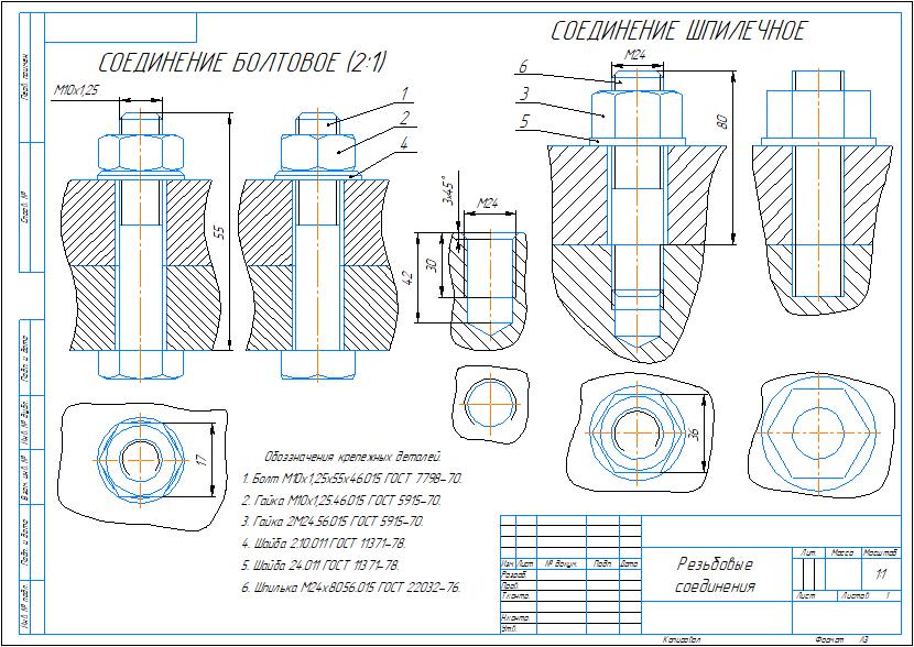 Чертеж болтового соединения с резьбой М10х1,25, шпилечного соединения с резьбой М24. Чертежи выполнены в программе Компас