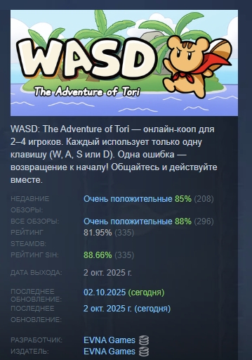 WASD: The Adventure of Tori — онлайн*кооп для 2–4 игроков. Каждый использует только одну клавишу (W, A, S или D). Одна ошибка — возвращение к началу! Общайтесь и действуйте вместе.