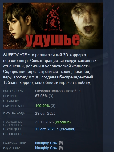 SUFFOCATE это реалистичный 3D-хоррор от первого лица. Сюжет вращается вокруг семейных отношений, религии и человеческой жадности. Содержание игры затрагивает кровь, насилие, веру, эротику и т. д., создавая беспрецедентный Тайвань хоррор, способности игроков к побегу, решению головоломок, и смелость.