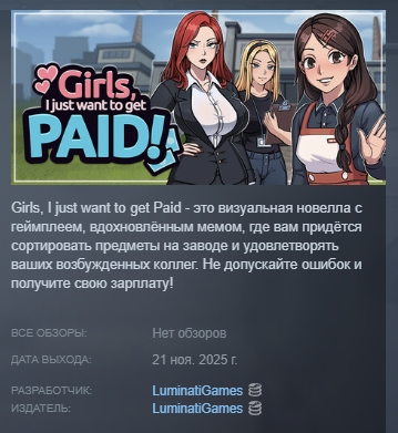 Girls, I just want to get Paid - это визуальная новелла с геймплеем, вдохновлённым мемом, где вам придётся сортировать предметы на заводе и удовлетворять ваших возбужденных коллег. Не допускайте ошибок и получите свою зарплату!